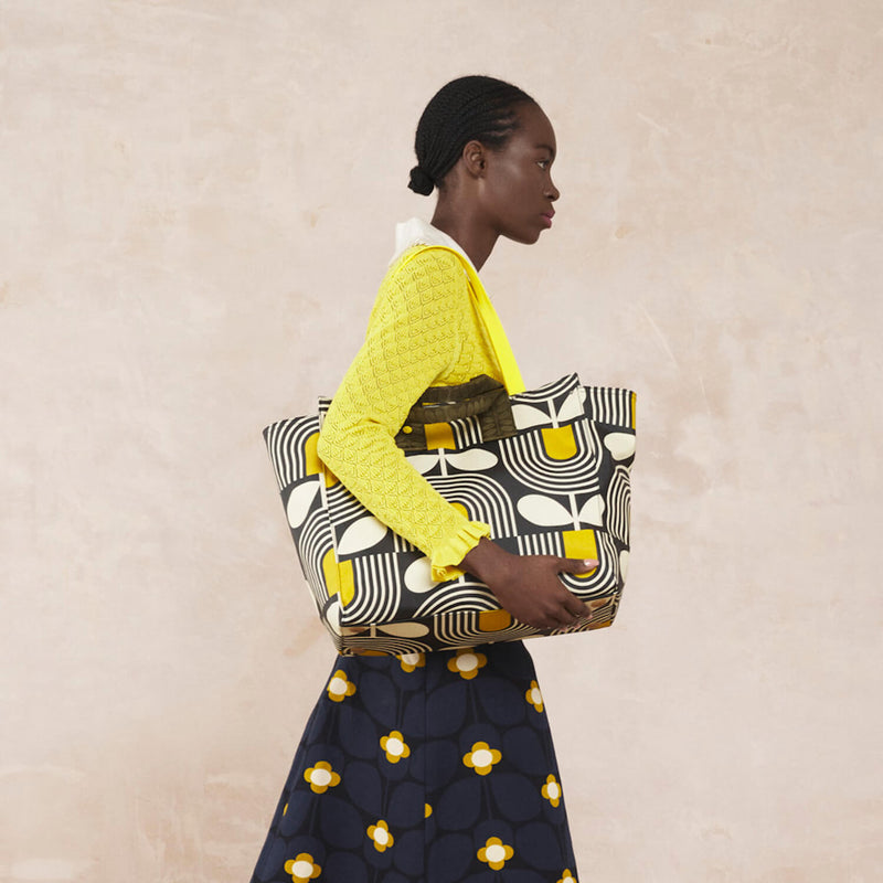 Our much-loved Striped Tulip design is back for Spring/Summer, with pops of dandelion yellow, cream stems and a black background. The bold, retro inspired pattern is a fun, 1970s take on florals and makes a real statement.